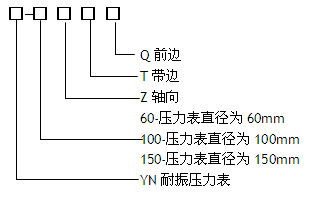 例:Y-100ZTQ 0~1MPa代表直徑為100mm,軸向帶前邊測(cè)壓范圍0~1MPa的耐振壓力表.